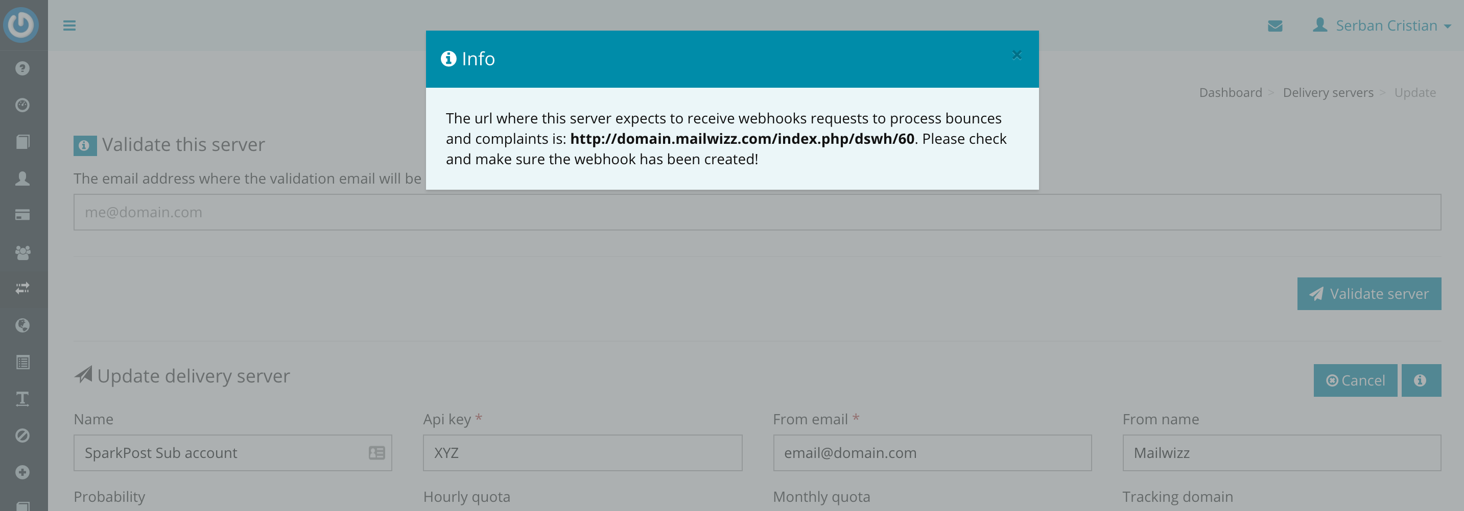 Up until MailWizz version 1.3.8.5, if you were to create a delivery server of type SparkPost web api in MailWizz and the API key belongs to a sub-account, then you would get an error(Forbidden!) and you wouldn’t be able to properly validate the delivery server, so you’d be forced to use a master account.
